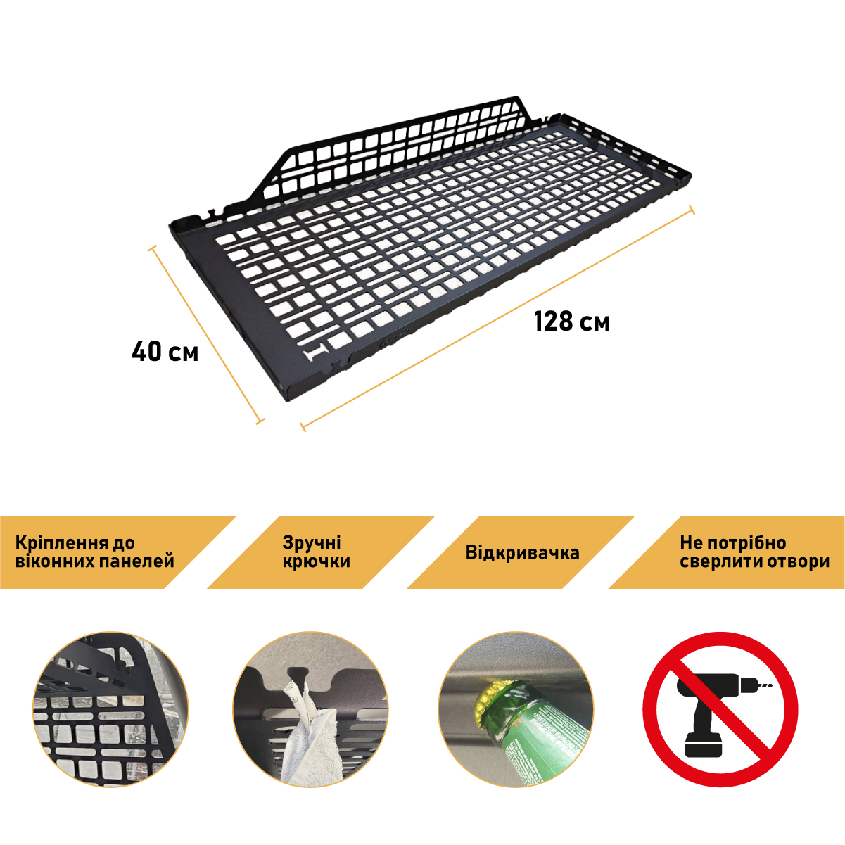 Полиця кріпиться до Молле-панелі на вікна (панелі на вікна в комплект не входять, їх можна купити окремо). Для монтажу полиці не потрібно свердління деталей автомобіля, що забезпечує швидке та просте встановлення. Ви зможете встановити полицю самостійно без допомоги спеціалістів.
