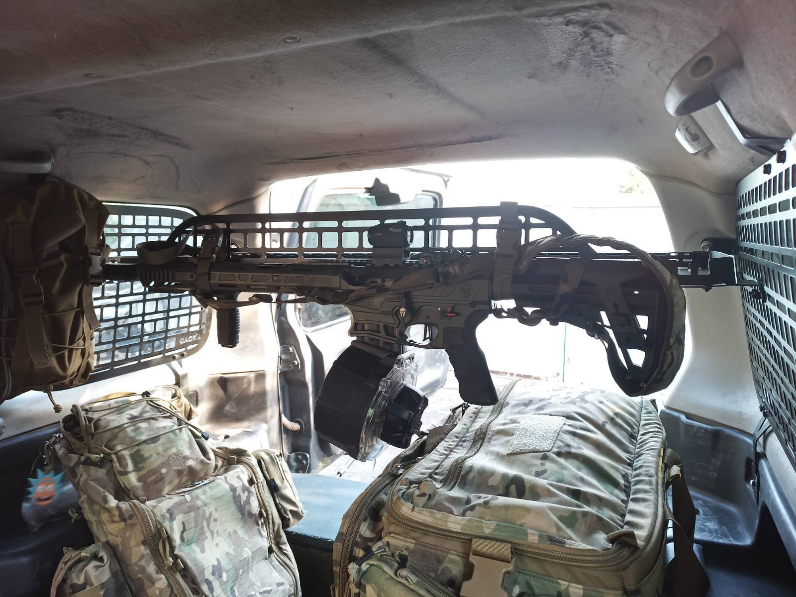 Полиця виконана у форматі молле-панелі, що дозволяє кріпити тактичне спорядження, зброю або інструменти за допомогою різних систем кріплення.