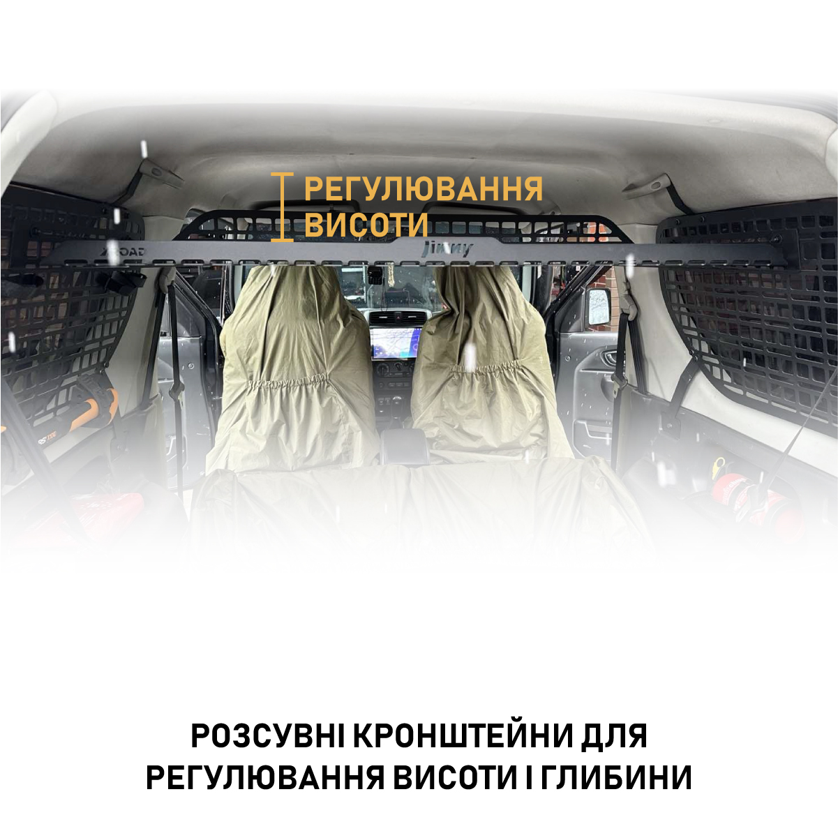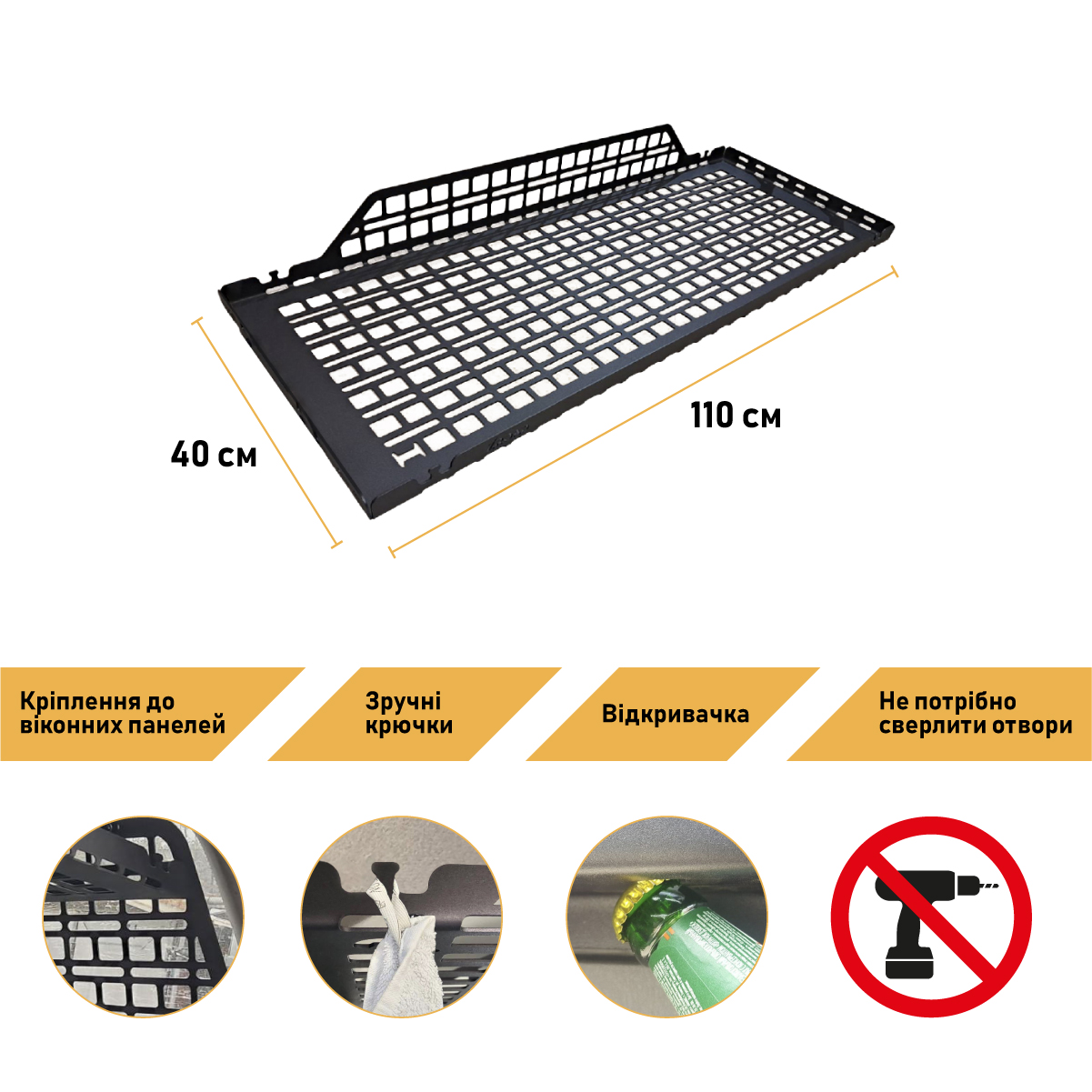 Полиця кріпиться до Молле-панелі на вікна (панелі на вікна в комплект не входять, їх можна купити окремо). Для монтажу полиці не потрібно свердління деталей автомобіля, що забезпечує швидке та просте встановлення. Ви зможете встановити полицю самостійно без допомоги спеціалістів.