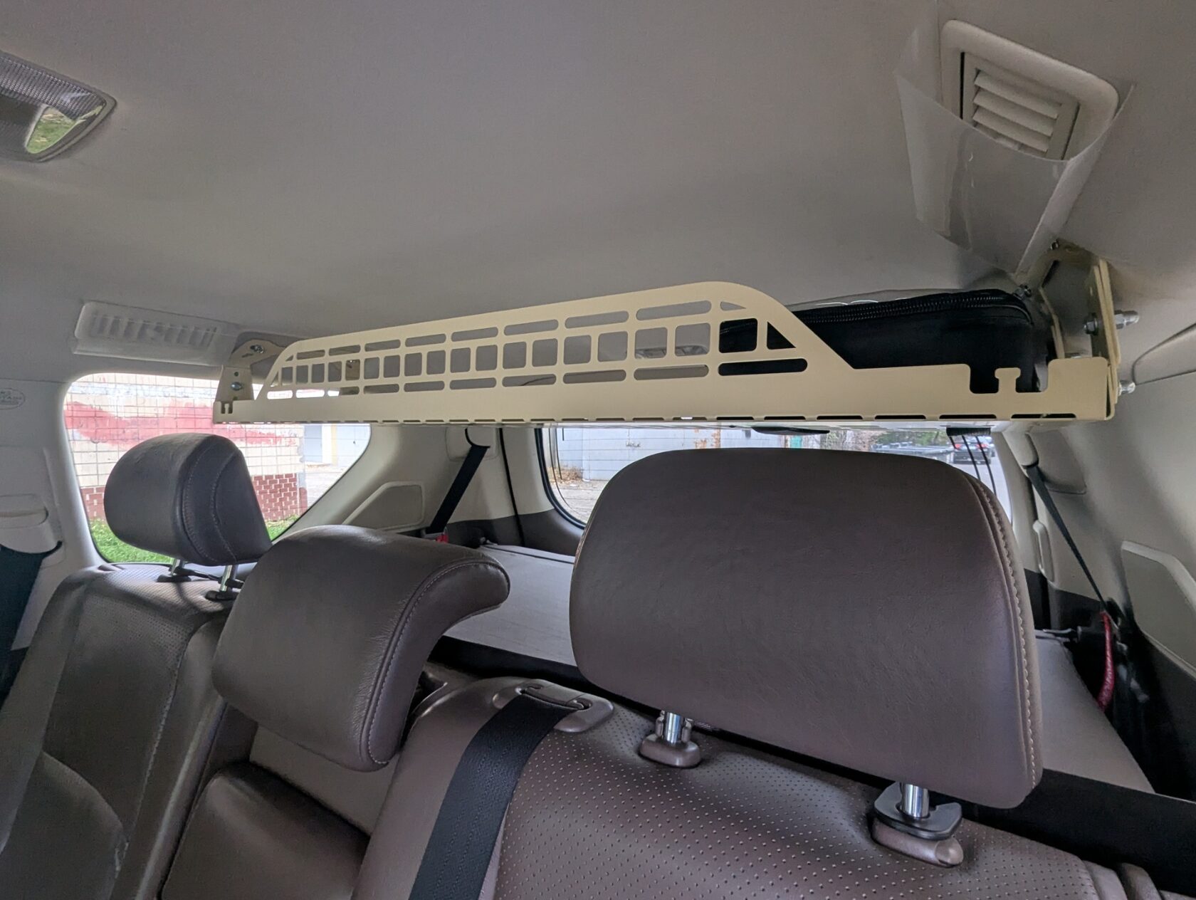 Конструкція полиці дозволяє кріпити необхідні речі до полиці не тільки зверху, а й знизу, тим самим забезпечуючи додаткове місце зберігання в багажнику. Розмір молле-вікон стандартний, що дозволяє кріпити типове армійське спорядження. Круглі отвори дозволяють кріпити гумові стропи, клепальні гайки та підходять для універсальних гумових кріплень QuickFist.