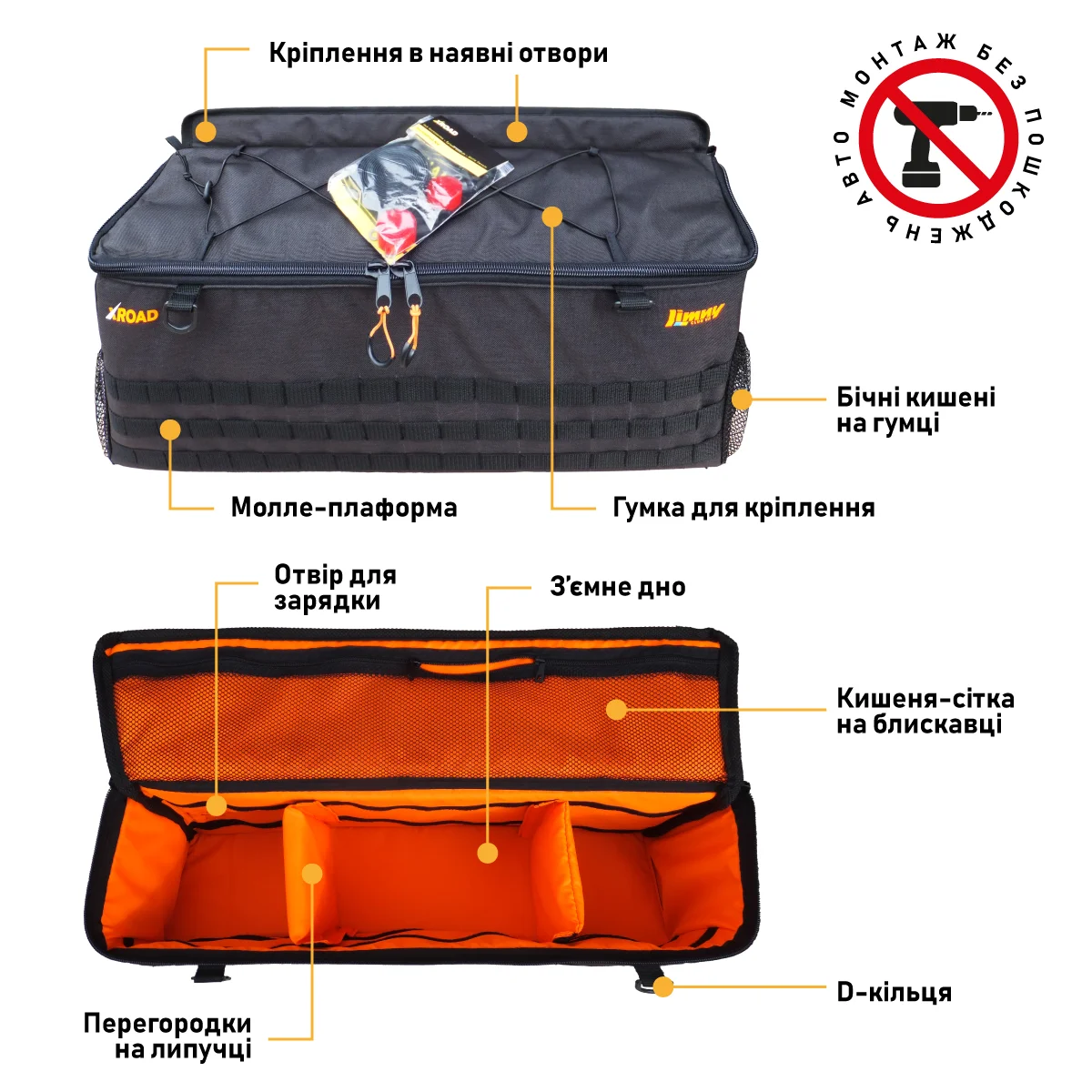 Сумка розміщується у вільній ніші багажного відділення і є відмінним додатковим місцем для зберігання великого обсягу корисних речей. При цьому багажник залишається вільним.