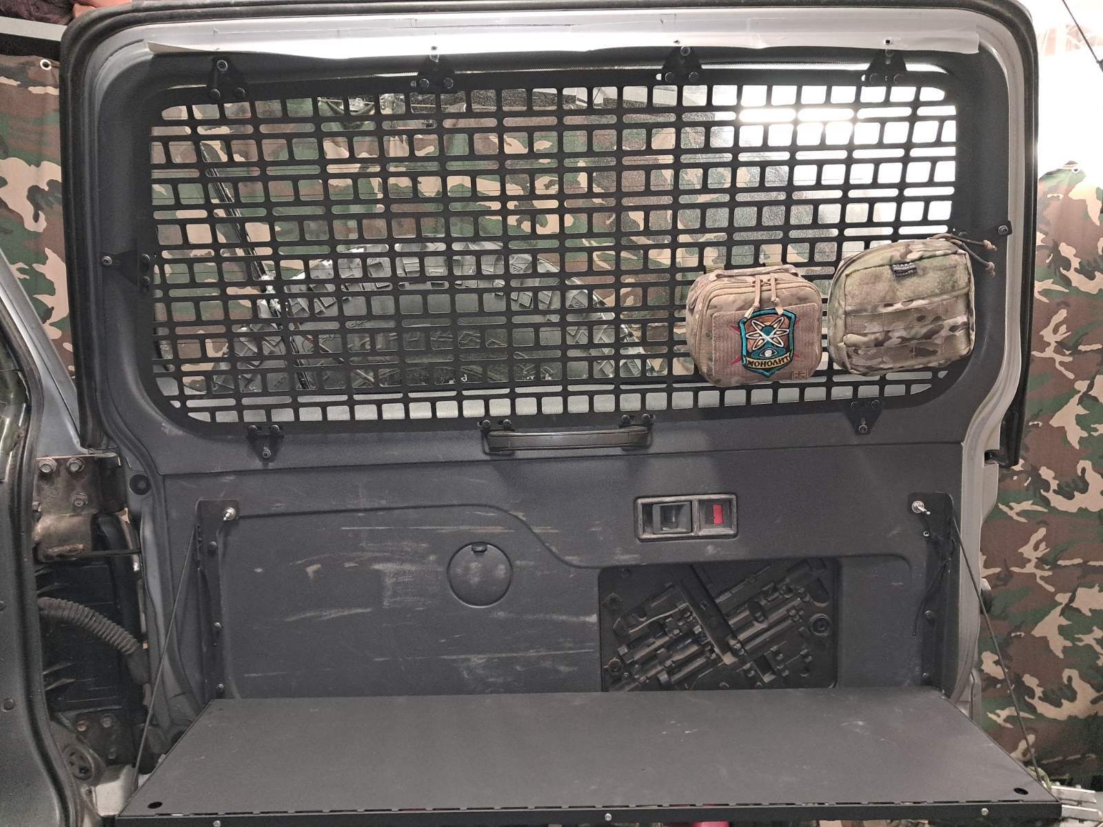 В складеному стані стіл виконаний в форматі моллє-панелі, що дозволяє розміщувати тактичне спорядження, зброю або інструменти за допомогою різних систем кріплення. Розмір молле-вікон стандартний для кріплення типового армійського спорядження. Круглі отвори дозволяють кріпити гумові стропи, клепальні гайки та підходять для універсальних гумових кріплень QuickFist.