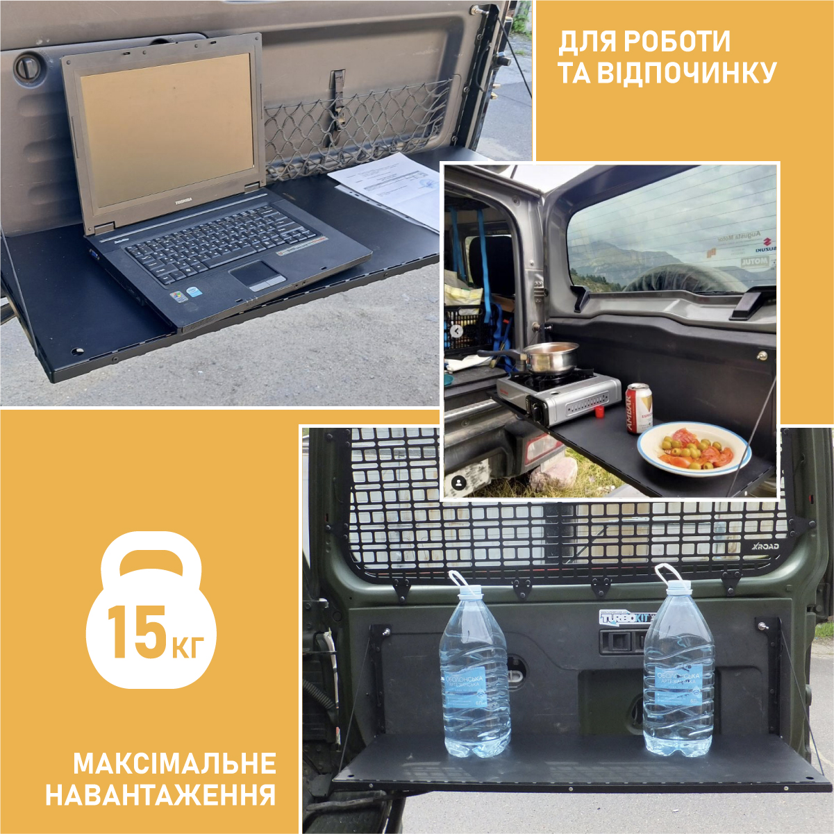 - Гнучкі і безшумні петлі забезпечють швидке регулювання кута розкриття столу в горизонтальну площину з урахуванням рельєфу місцевості, на якій стоїть автомобіль.