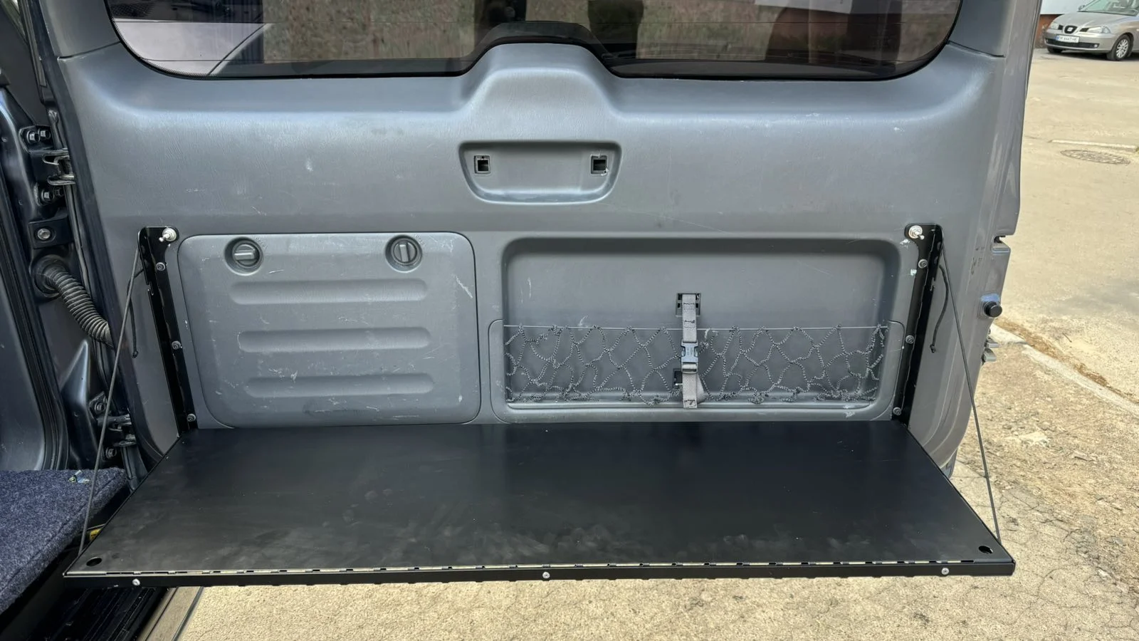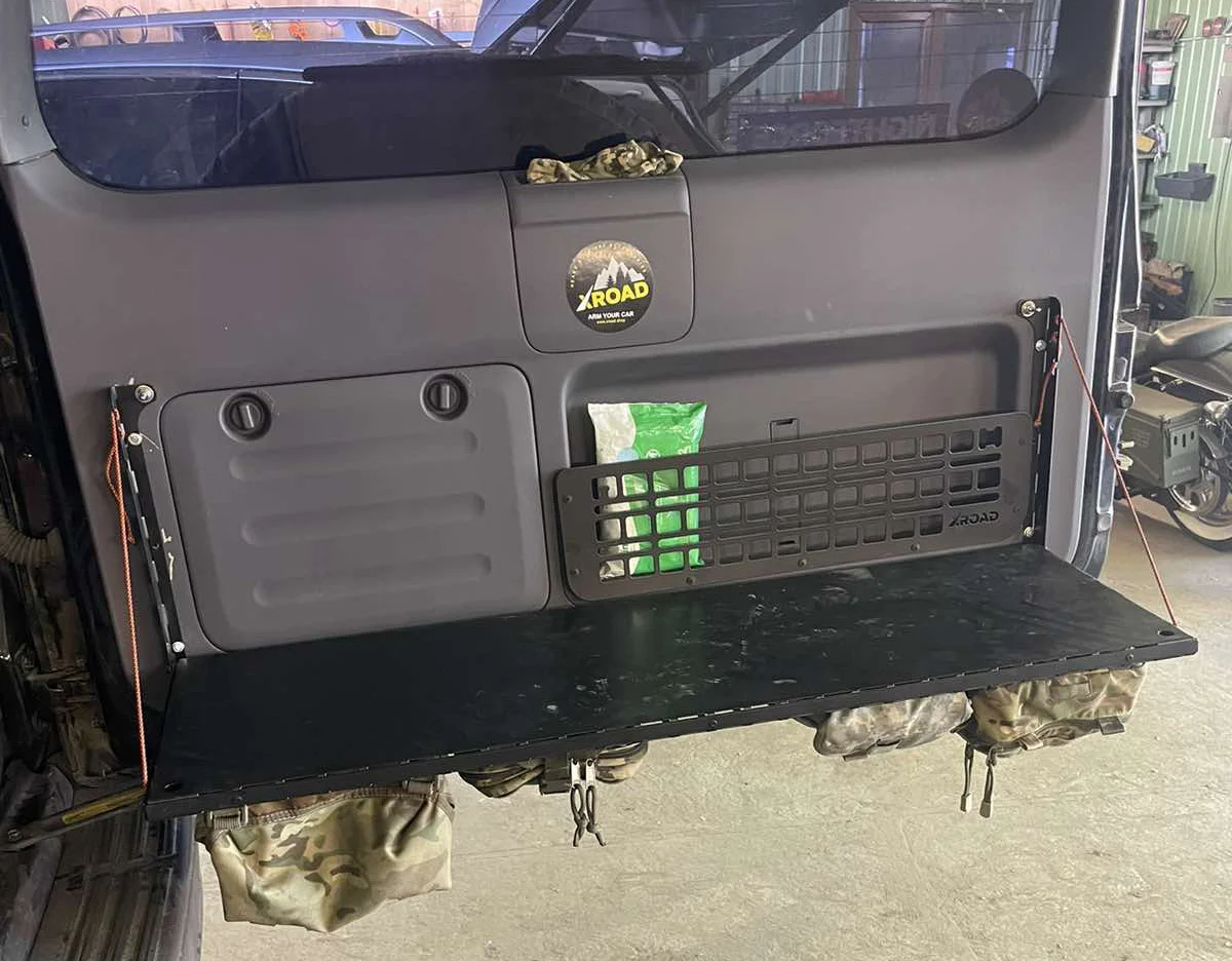 - У другому варіанті столик може бути повністю знятий з дверей багажника та використовуватись окремо. Столик легко демонтується та встановлюється на будь-яку рівну поверхню. Коли столик повністю знятий з дверей багажника, на них залишається моллє-панель з прикріпленими до неї підсумками і інструментами.